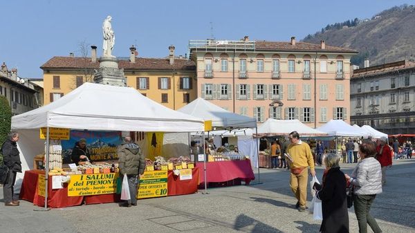 In piazza Volta a Como la protesta dei commercianti contro il mercatino di prodotti tipici che è stato allestito venerdì mattina per il week end. Le bancarelle - accusano i negozi - sono a ridosso delle vetrine