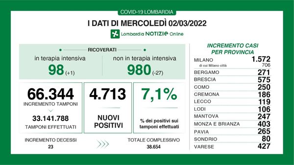 Scendono i ricoverati, in Lombardia 23 decessi