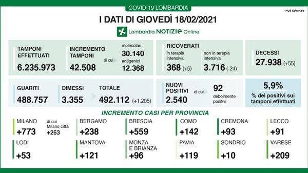 In Lombardia 55 nuovi decessi e 1.200 guariti