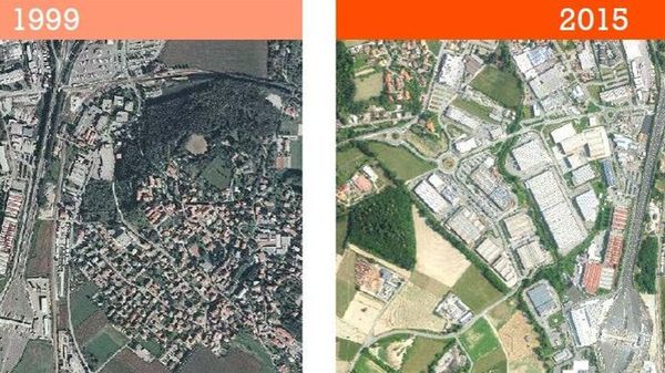 Legambiente e Coldiretti mostrano come i capannoni abbiano cancellato prati e boschi