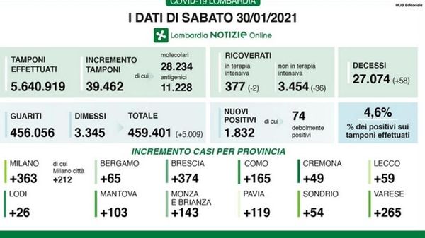 Altri 58 decessi in Lombardia per un totale di 27.074