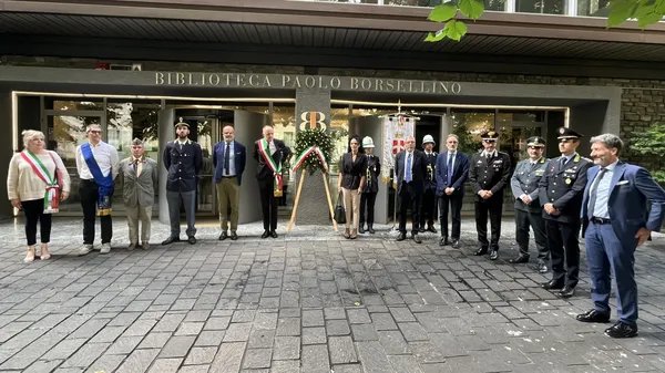 La commemorazione Corona di fiori all’esterno della biblioteca di Como, intitolata al giudice Paolo Borsellino