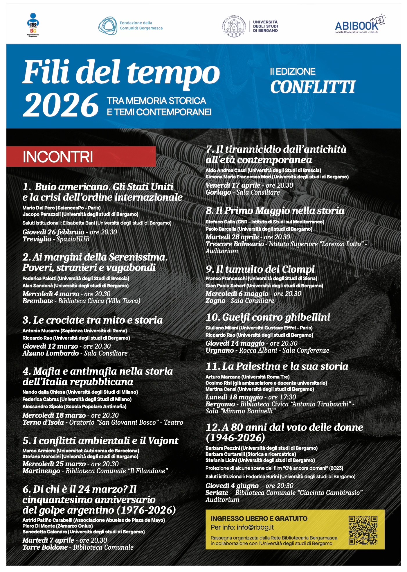 «Fili del Tempo» è una rassegna a carattere storico organizzata da Rete Bibliotecaria Bergamasca in collaborazione con l'Università degli studi di Bergamo. Questa seconda edizione della rassegna è dedicata ai conflitti nella storia. Un argomento che attraversa epoche, luoghi e società, e che rappresenta una delle dimensioni costanti e più complesse dell'esperienza umana. A ogni latitudine e in ogni periodo storico, infatti, il conflitto nasce dall'incontro – e spesso dallo scontro – tra interessi, identità e visioni del mondo differenti.