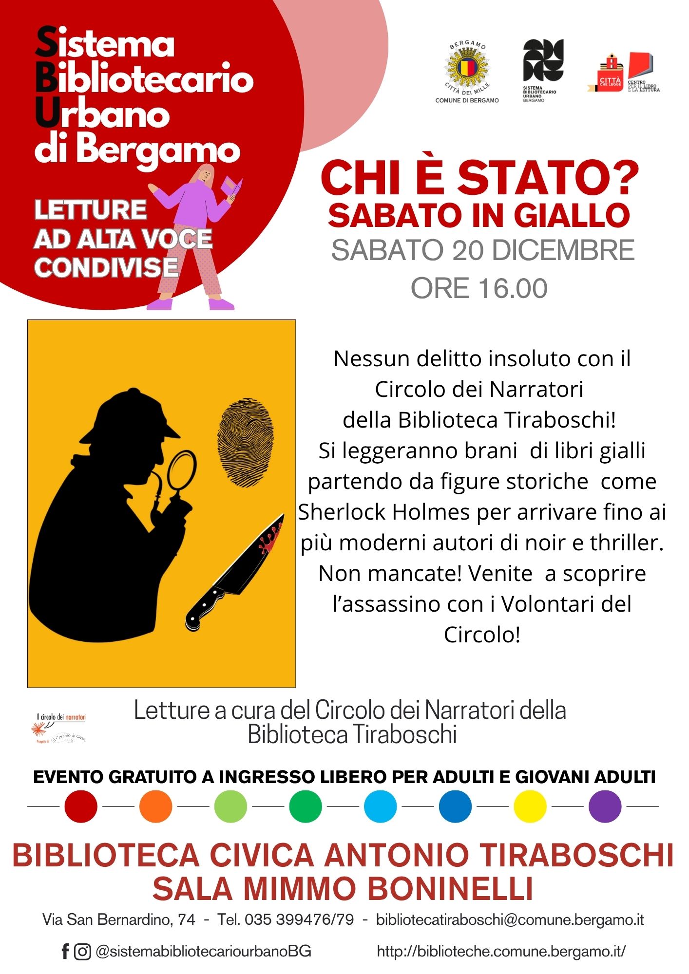 Dicembre si tinge di giallo con i volontari del Circolo dei Narratori, che proporranno brani di libri di uno dei generi preferiti da lettrici e lettori. Si partirà da personaggi entrati nell'immaginario universale come Sherlock Holmes per arrivare fino ai più moderni autori di noir e thriller.