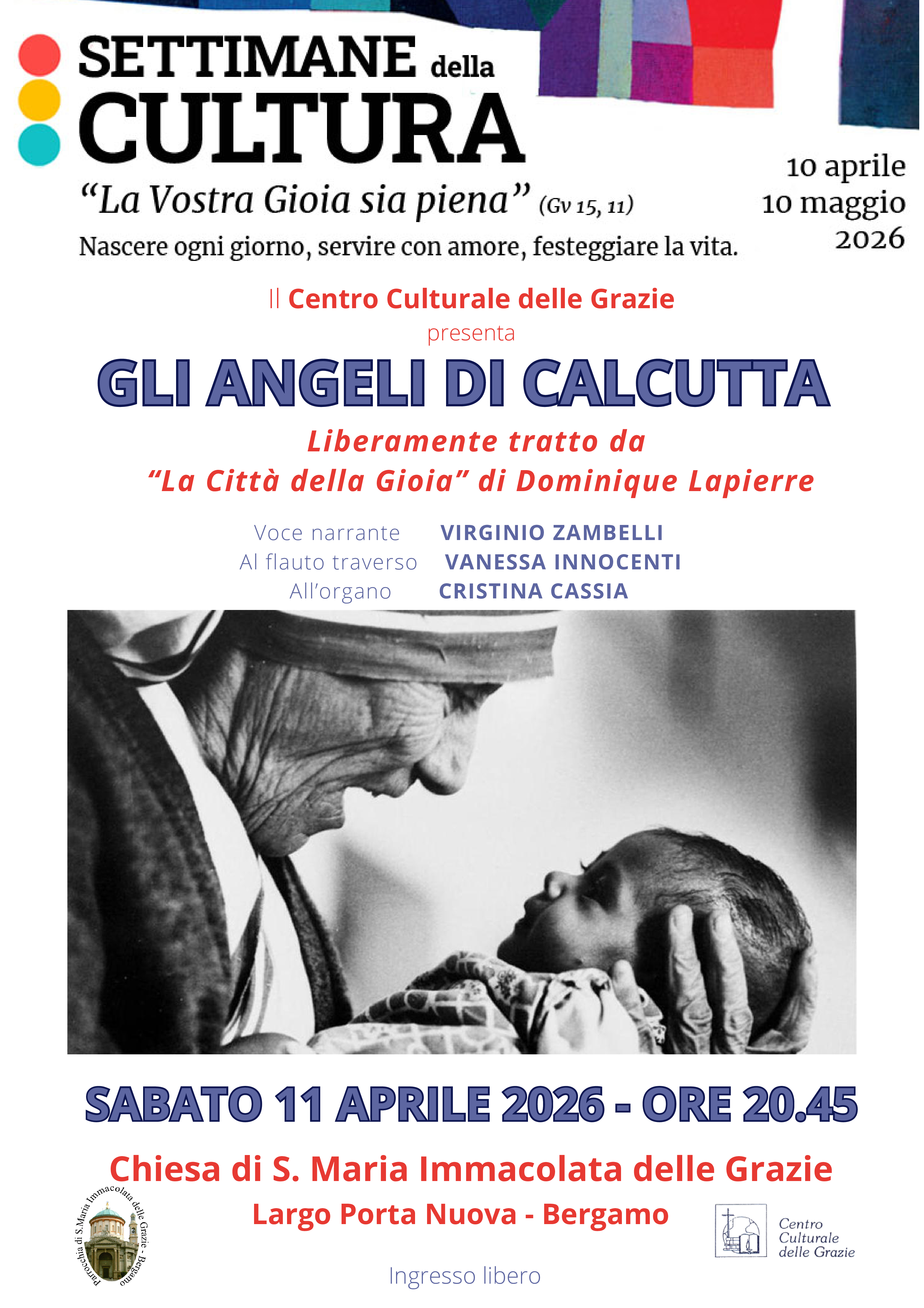 Per gli eventi della «Settimane della Cultura», presso la Chiesa di S. Maria Immacolata, è in programma la lettura di brani dedicati a madre Teresa di Calcutta e al sacerdote francese Paul Lambert, con la partecipazione del fotoreporter Giorgio Fornoni.
