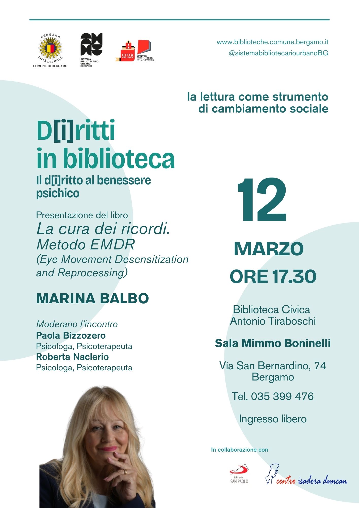 Per il ciclo di incontri «D[i]ritti in biblioteca» alla Biblioteca Tiraboschi di Bergamo, è in programma la presentazione del libro della psicoterapeuta Marina Balbo, alla scoperta del metodo EMDR.