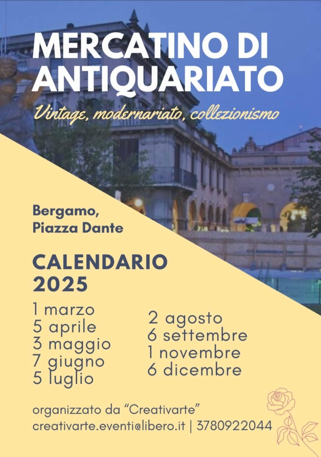 Un'affascinante immersione del passato, dove ogni oggetto racconta una storia: arredi, libri, gioielli e pezzi di modernariato in un mercatino d'antiquariato che ogni primo sabato del mese arricchisce Piazza Dante con la sua bellezza senza tempo.