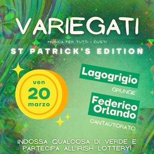 Il nuovo appuntamento della rassegna Variegati! sarà interamente dedicato alla Festa di San Patrizio. Dopo il quiz e liIrish lottery, destinata a chi si presenterà indossando qualcosa di color verde, spazio ai live di Lagogrigio, tra ruvidità grunge e delicatezza compositiva e di Federico Orlando, cantautore cresciuto tra letteratura e grandi nomi italiani e americani.