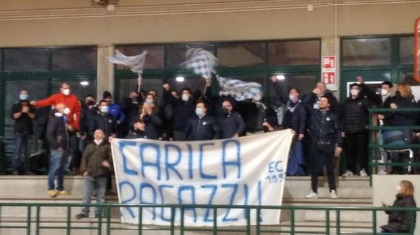Uno striscione («Carica ragazzi!!»), qualche coro, fumogeni e una foto – distanziati – con la squadra