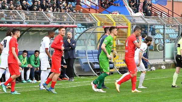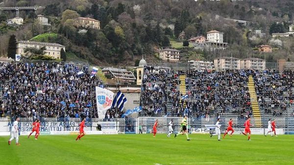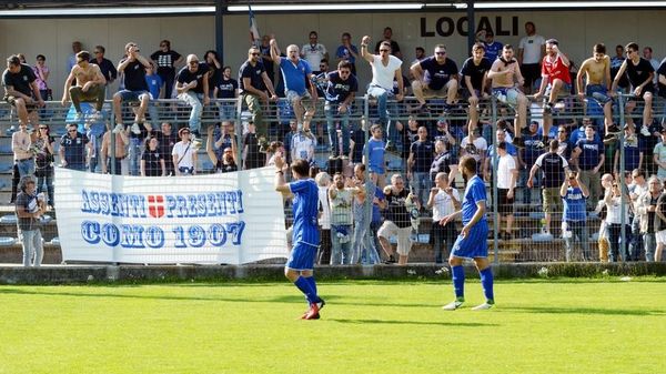 L’attaccante del Como pizzicato da un guardalinee durante la partita di Olginate