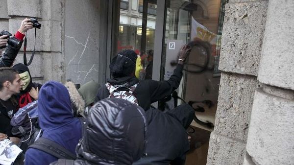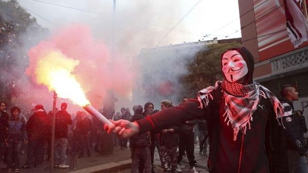 Gruppo si stacca da corteo con fumogeni e striscioni