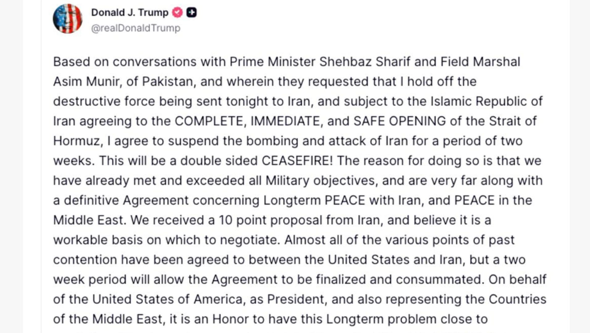 «La ragione di tale decisione - ha scritto questa notte, a un’ora e mezza dalla scadenza dell’ultimatum, e dopo una mediazione da parte del Pakistan, in un messaggio sul suo social Truth - risiede nel fatto che abbiamo già raggiunto e superato tutti gli obiettivi militari e siamo a un punto molto avanzato nella definizione di un accordo definitivo riguardante una pace a lungo termine con l’Iran, nonché la pace in Medio Oriente».Trump ha precisato poi che lo stop ai bombardamenti vale «a condizione che l’Iran acconsenta all’apertura immediata e completa dello Stretto di Hormuz».