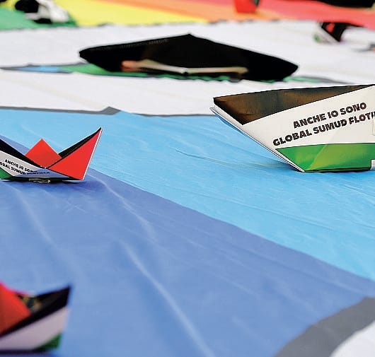 Basta guardare le centinaia di barche e barchette e motoscafi e lucie e velarche e comballi che ogni giorno scendono l’Adda per entrare nel lago di Como e poi di nuovo nell’Adda e poi nel Po e poi nel mare magno per raggiungere ogni luogo della terra dove ci sia bisogno di loro: la Flotilla in Sud Sudan perché lì ammazzano i bambini innocenti a migliaia, la Flotilla in Iran perché lì uccidono gli studenti innocenti a migliaia, la Flotilla in Ucraina, perché lì uccidono i civili innocenti a migliaia e rapiscono i bambini innocenti a migliaia, la Flotilla in ogni angolo più sperduto del globo terracqueo, senza guardare in faccia a nessuno, perché per il flotillero ogni bisogno è uguale, ogni oppresso merita rispetto, ogni prepotenza va denunciata e punita. Diciamoci la verità. La Flotilla è come la Croce Rossa, un simbolo internazionalmente riconosciuto, senza colori né appartenenze. Nessuno fa politica sulla Flotilla, capito?