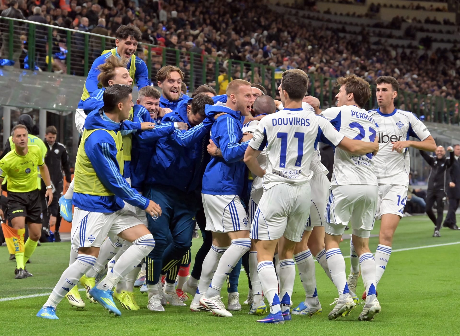 Fabregas appuntisce, cesella, affina il suo lavoro tattico, presentando un 3-4-2-1 atteso, solo che poi ha uno sviluppo 3-4-3 dove però a sorpresa (mica troppo) i due esterni d’attacco sono Valle e Van der Brempt, mentre Baturina e Paz si allargano e stanno un passo avanti a Perrone-Da Cunha. A proposito di Van der Brempt, quando lo vedi in campo, e ripensi alla partita di campionato, dici: addio. Tranquilli ragazzi stavolta non deve fare il marcatore. E si inventerà l’assist (non banale) dell’1-0. Non basterà. Quell’1-0 che fa esplodere il settore dei tifosi comaschi. Cori possenti da lassù, il famigerato terzo anello, dove si respira aria buona e si vede lo sky line della città (spunta un nuovo grattacielo).