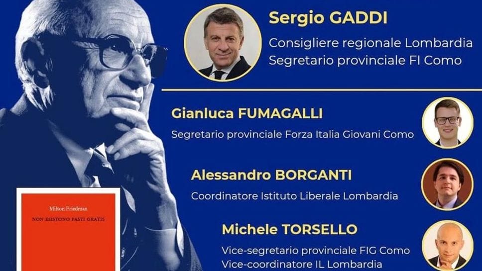 Questa sera, 21 novembre, alle 21 allo Yacht Club di Como si terrà un incontro con Forza Italia per ragionare sulle pagine di Milton Friedman “Non esistono pasti gratis”, una raccolta di saggi che esplorano il pensiero dell’economista, dall’inflazione alla struttura del welfare state, passando per la violenza della pressione fiscale, la riforma del sistema scolastico e l’assurdità del sistema pensionistico.