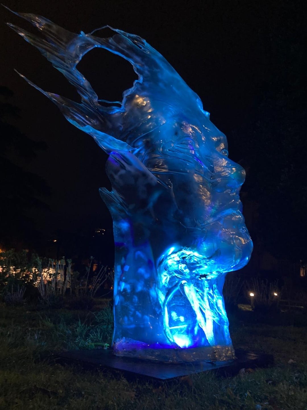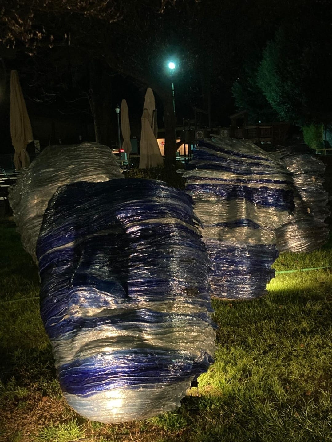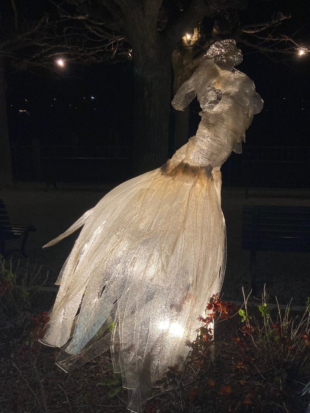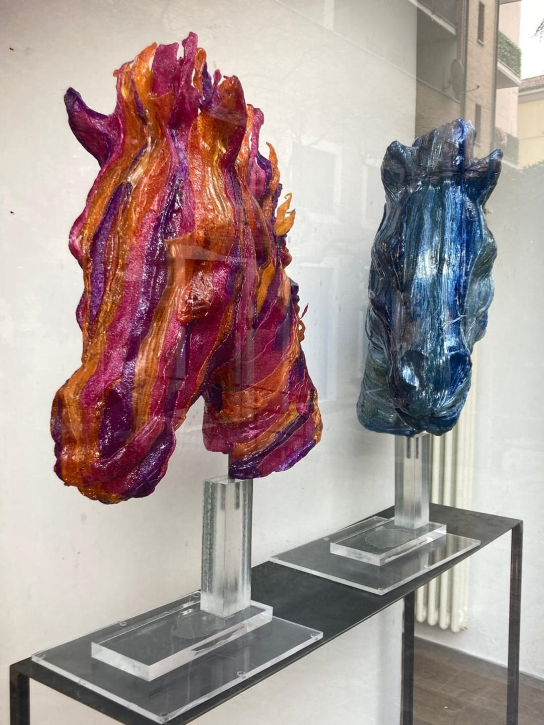 Il polimero plastico trasmette tanta luce. Più forte di giorno, inserito nel contesto urbano, ma di notte il retro illuminato fa apparire le opere più leggere, sospese, restituendo un racconto più onirico.